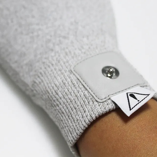 - Before putting the glove on, connect the metal snap to the glove and then attach the other end to the connector of one lead of your TENS machine.