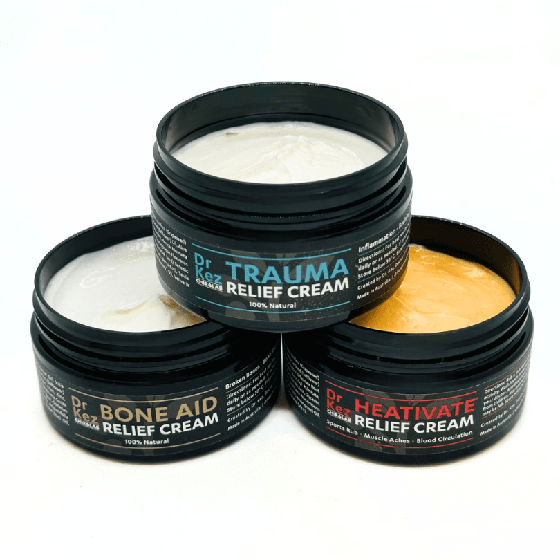 This format can be applied to most injuries. Bone Aid Relief Cream first on the bony part to treat the bone, then Trauma Relief Cream on the soft tissue areas surrounding the treatment area for the inflammation and lastly, the Heativate® Relief Cream for the increased blood circulation, easy!