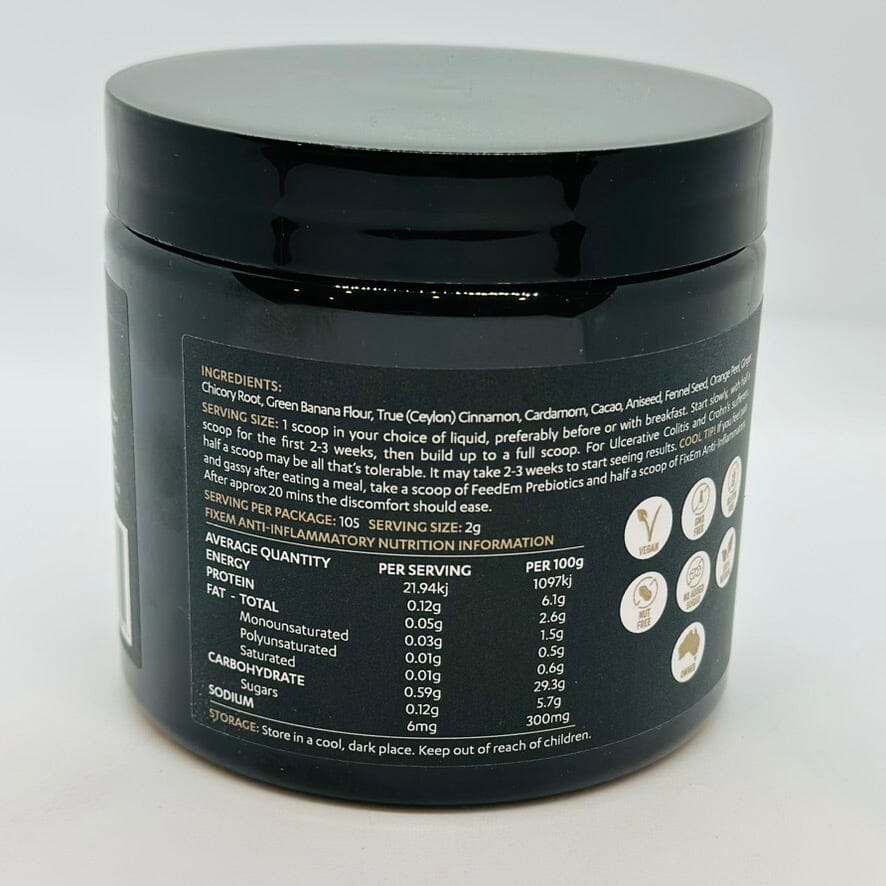 Cool Tip! If you feel pain and gassy after eating a meal, take a scoop of FeedEm Prebiotics and half a scoop of FixEm Anti-Inflammatory. After approx 20 mins the discomfort should ease. A powerful combo indeed!